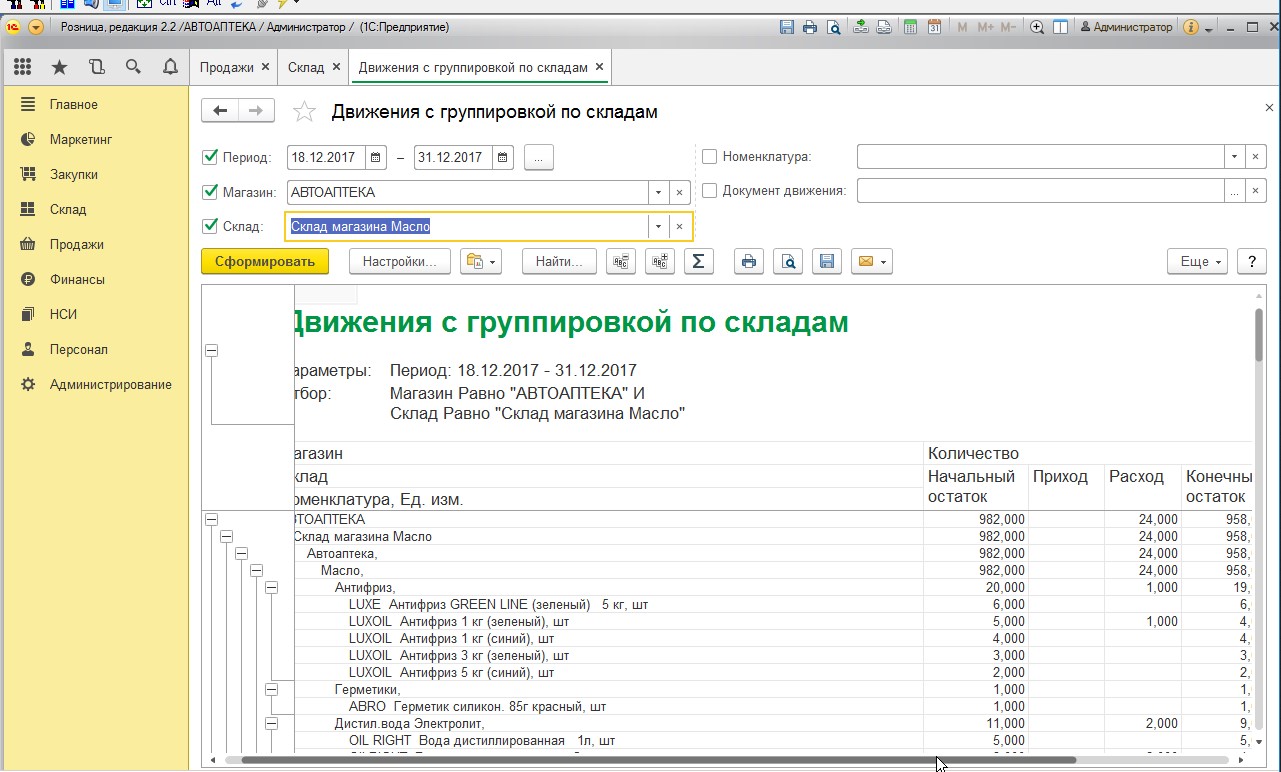 Требуется доработка стандартного отчета "Движение с группировкой по складам". Что необходимо сделать: