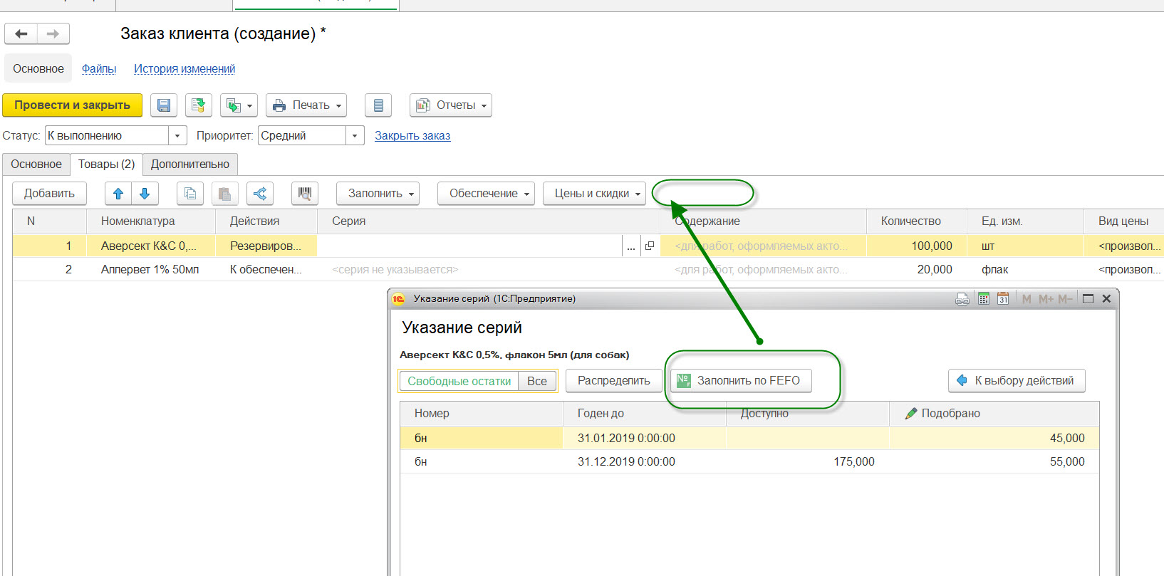 Программа подбирает серию по принципу «FEFO» - как в типовом механизме (в т.ч. разбивает товар на несколько строчек, если на остатках недостаточно товара по первой серии) – см. видео. https://yadi.sk/i/EQKCK-dB3RZzZB