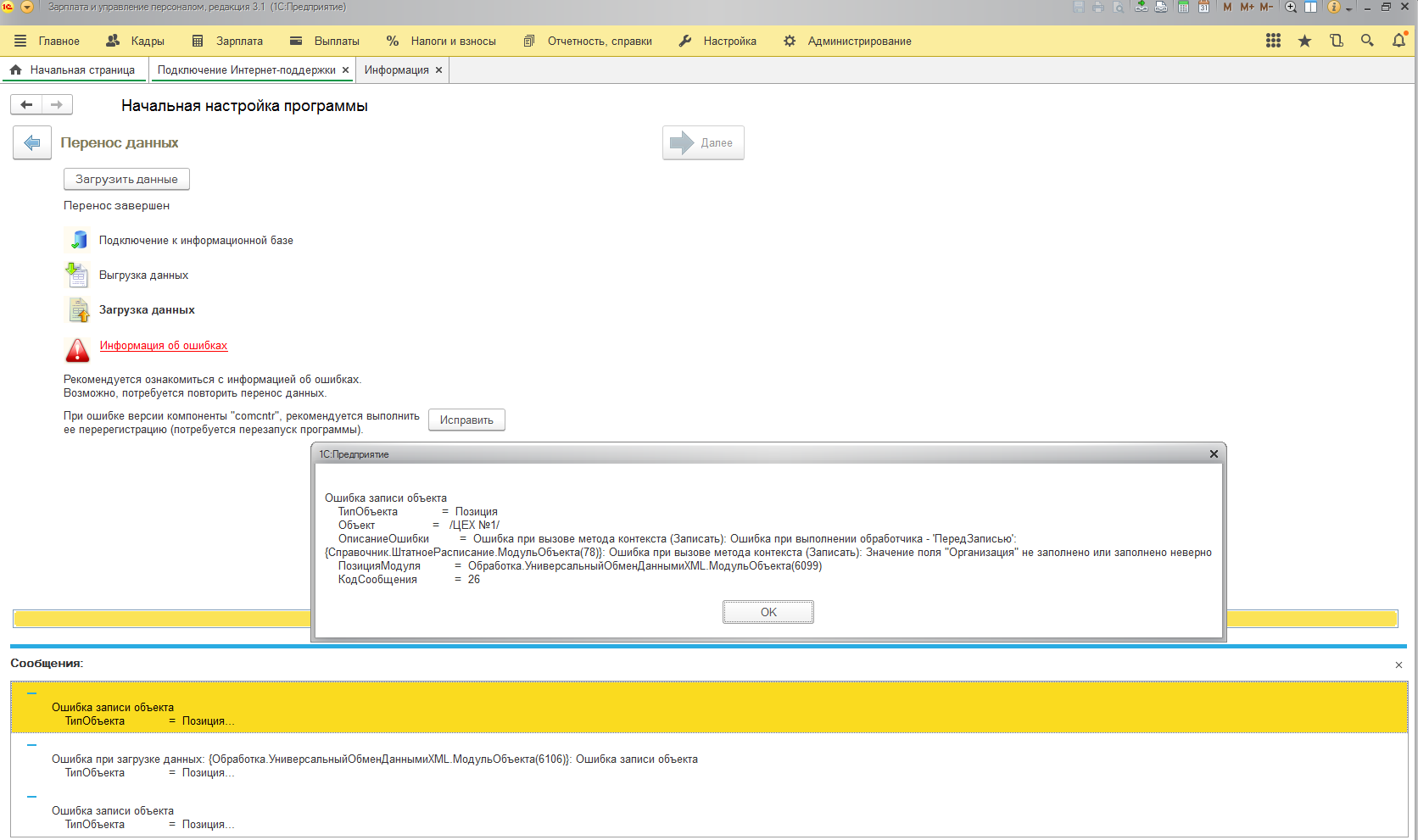 ОписаниеОшибки = Ошибка при вызове метода контекста (Записать): Ошибка при выполнении обработчика - 'ПередЗаписью': {Справочник.ШтатноеРасписание.МодульОбъекта(78)}: Ошибка при вызове метода контекста (Записать): Значение поля "Организация" не заполнено или заполнено неверно