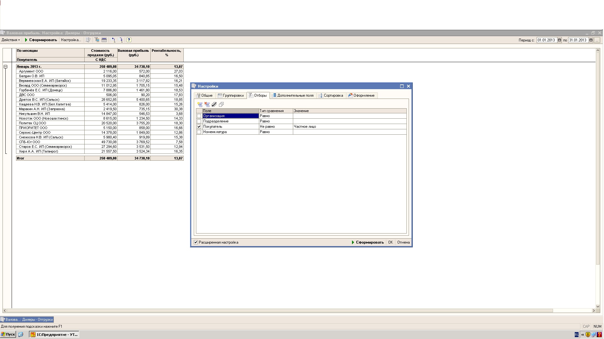 1. Показывается Валовая прибыль по месяцам по всей организации(если не указана всем организациям.)