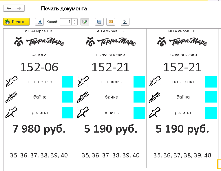 Сейчас после обновления у свойств номенклатуры "Материал верха", "Подкладка" и "Подошва" пропала возможность присоединить файл картинки. Поэтому ценники выглядят вот так: