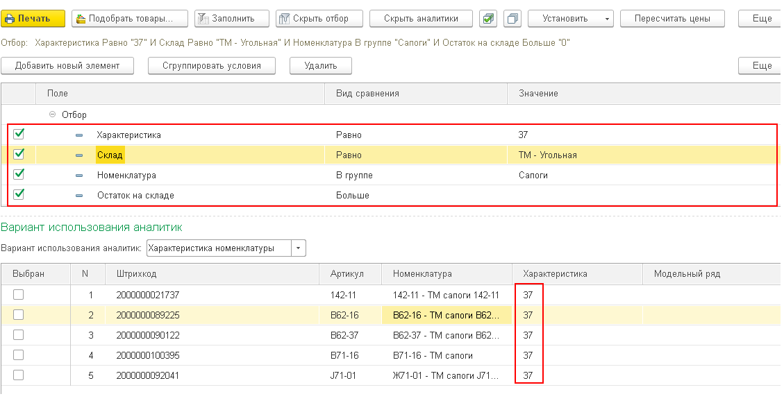 С помощью отбора я научился выводить только, например, 37-ые размеры одной модели. Но такое решение не работает, если мы отправляем товар с прошлого сезона и не у каждой модели есть 37-ой размер. Может быть такое, что в перемещение только 2 размера, 35 и 40. С таким отбором ценник для такой модели не будет создан.