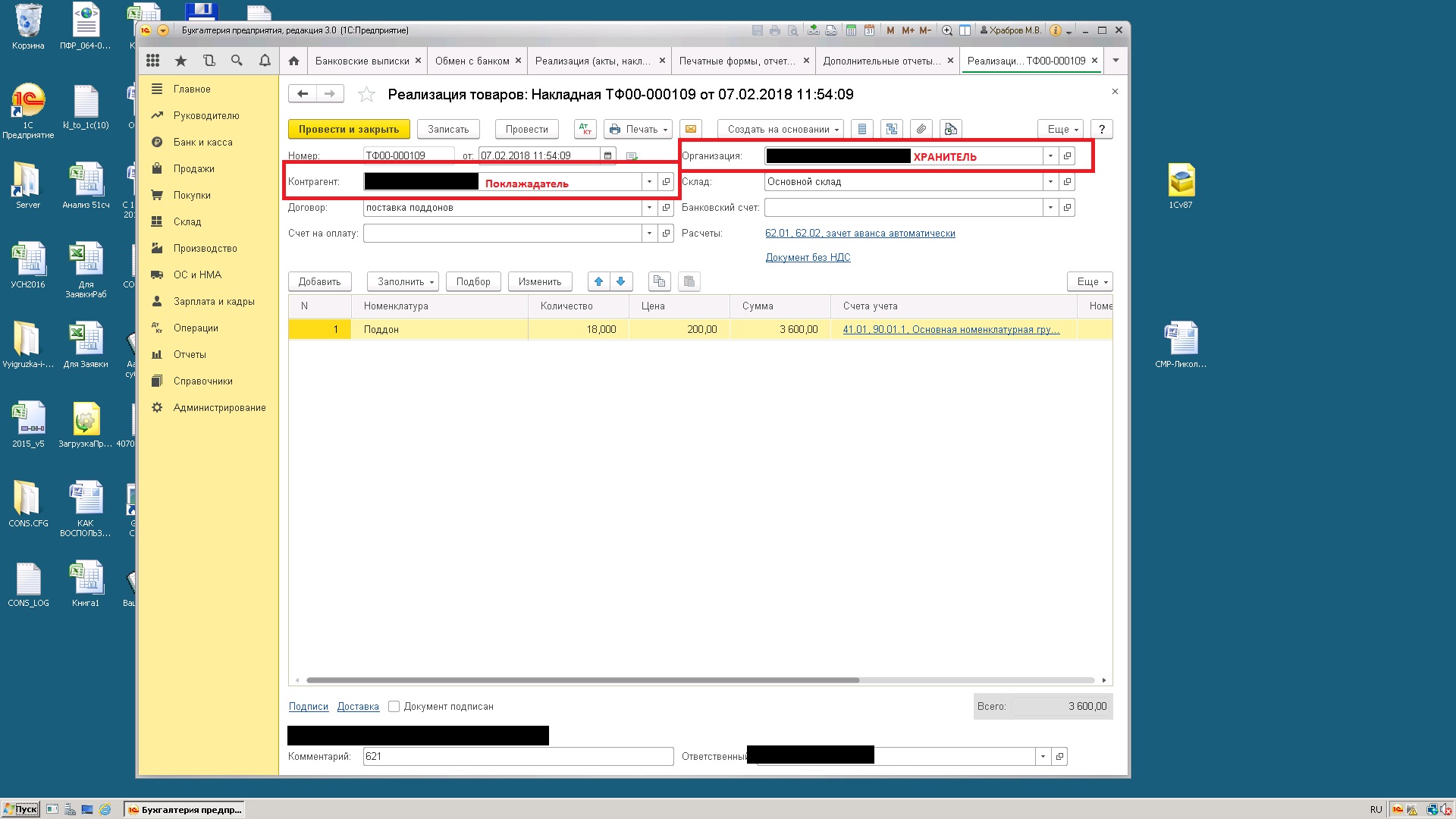 Есть внешняя печатная форма акта МХ-3 (возврат с ответственного хранения), которая присоединяется к документу "Реализация товаров и услуг". Но проблема в том, что в этой форме "хранитель" заполняется из поля "Контрагент" документа "Реализация товаров и услуг", а поклажадатель из поля "Организация", а нужно сделать наоборот.