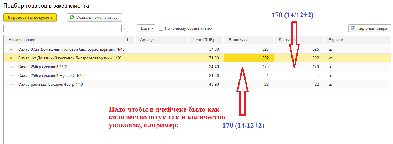 отображается количество в единицах хранения (у нас это штуки) отображалось еще количество в упаковках, как указано в примере. В скобках первая цифра - целое от деления количества в штуках на коэффициент упкаовки, вторая цифра - это коэффициент, третья цифра - остаток от деления количества в штуках на коэффициент. Т.е. нужно подправить только отображение и все, чтобы операторы не вычисляли на калькуляторе сколько коробок осталось того или иного товара. Скриншот прилагаю.