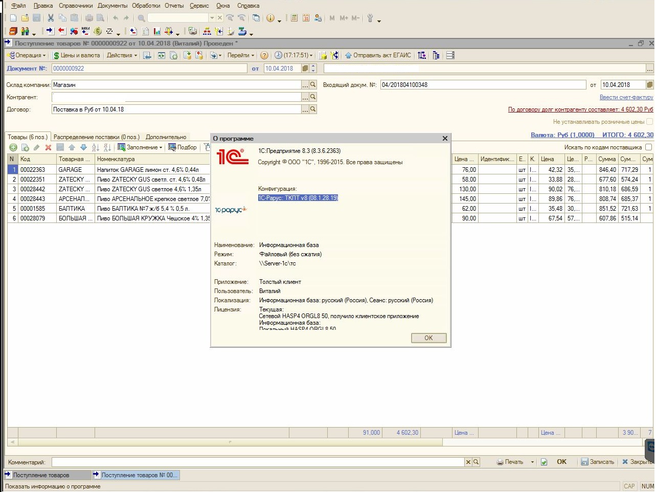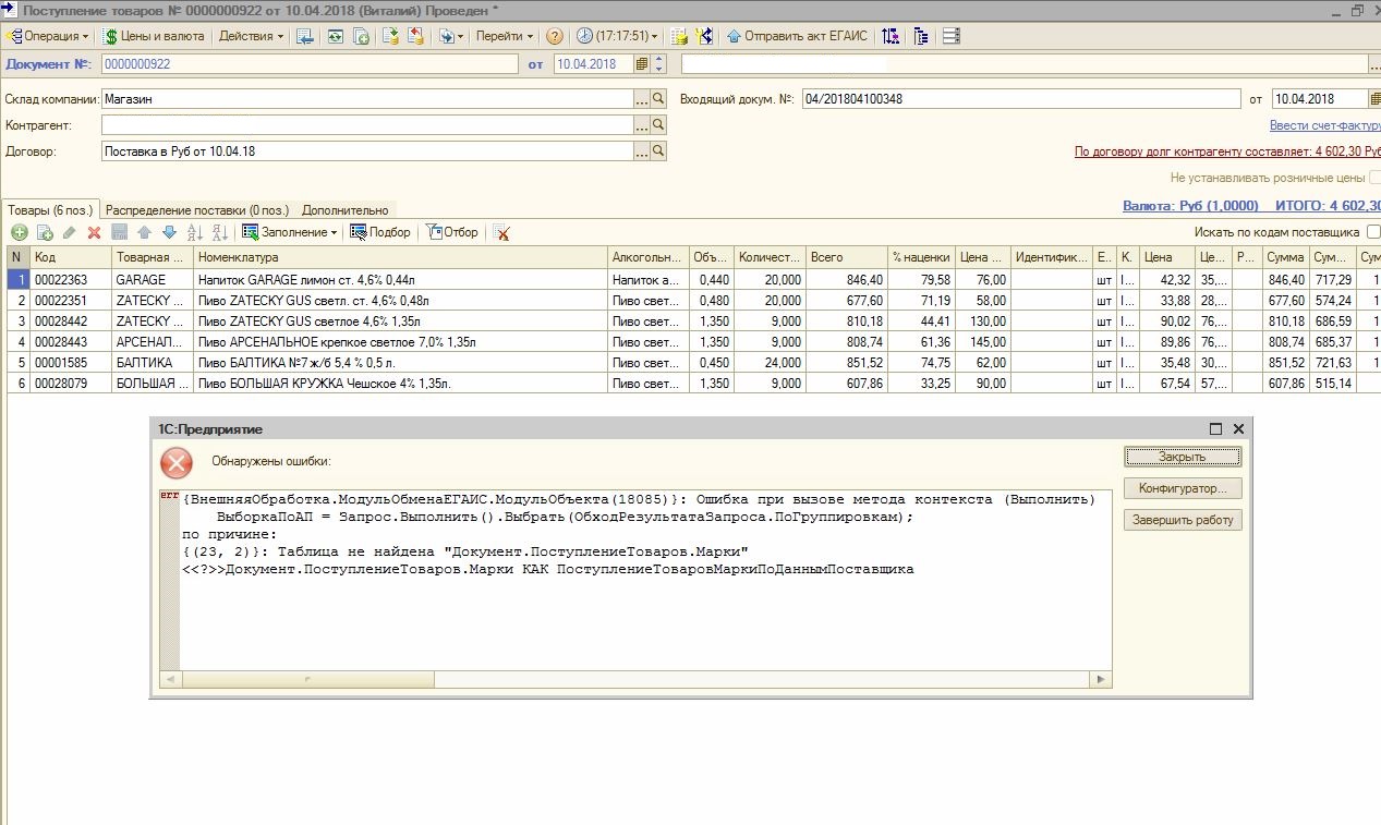 Ошибка при работе с Егаис 1С-Рарус ТКПТ 8 (0812819)