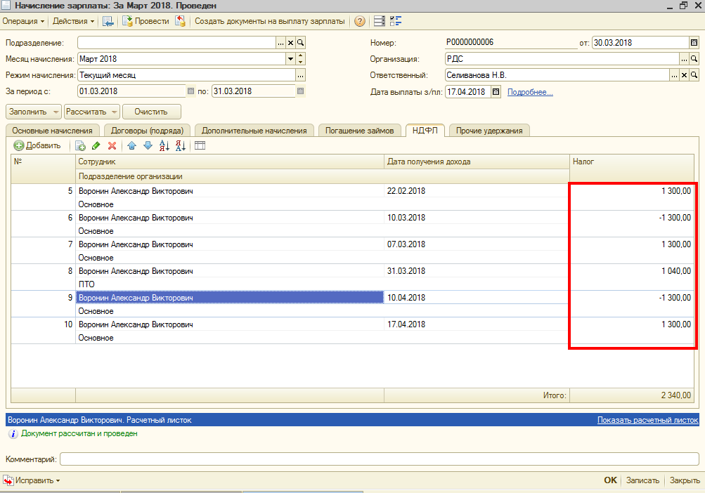 1. При начислении ЗП за март 2018 по сотрудникам Воронин, Гребеньков, Протопопов, Юганов, Трофимов программа делает "+" и "-" по начислению НДФЛ, например в документе Начисление ЗП за март 2018