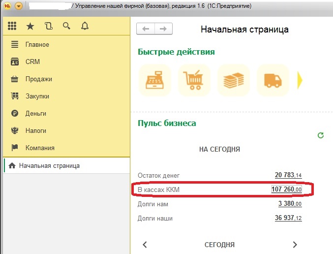 В 1с показывается на начальной странице: В кассах ККМ остаток денежных средств (наличные) - нужно научиться обнулять эту цифру. Скриншот прилагаю.