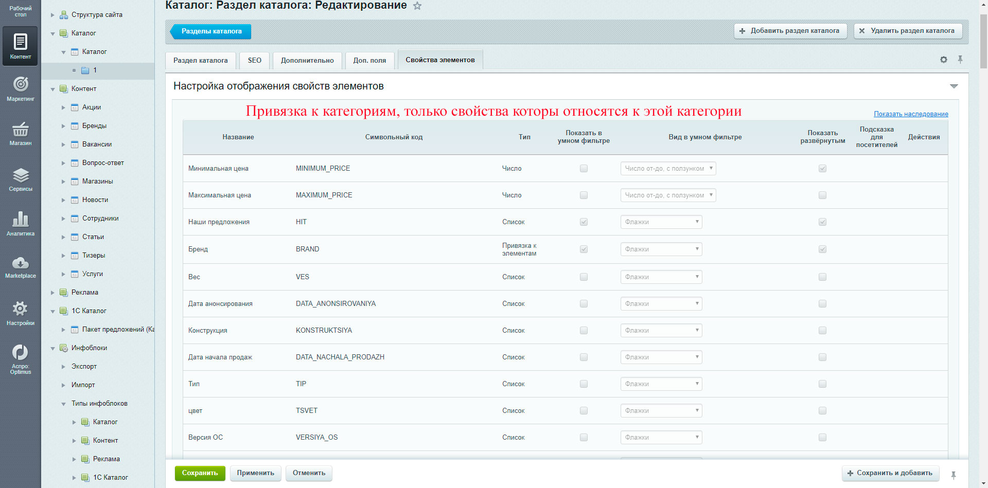 Привязывать свойства к категории на сайте