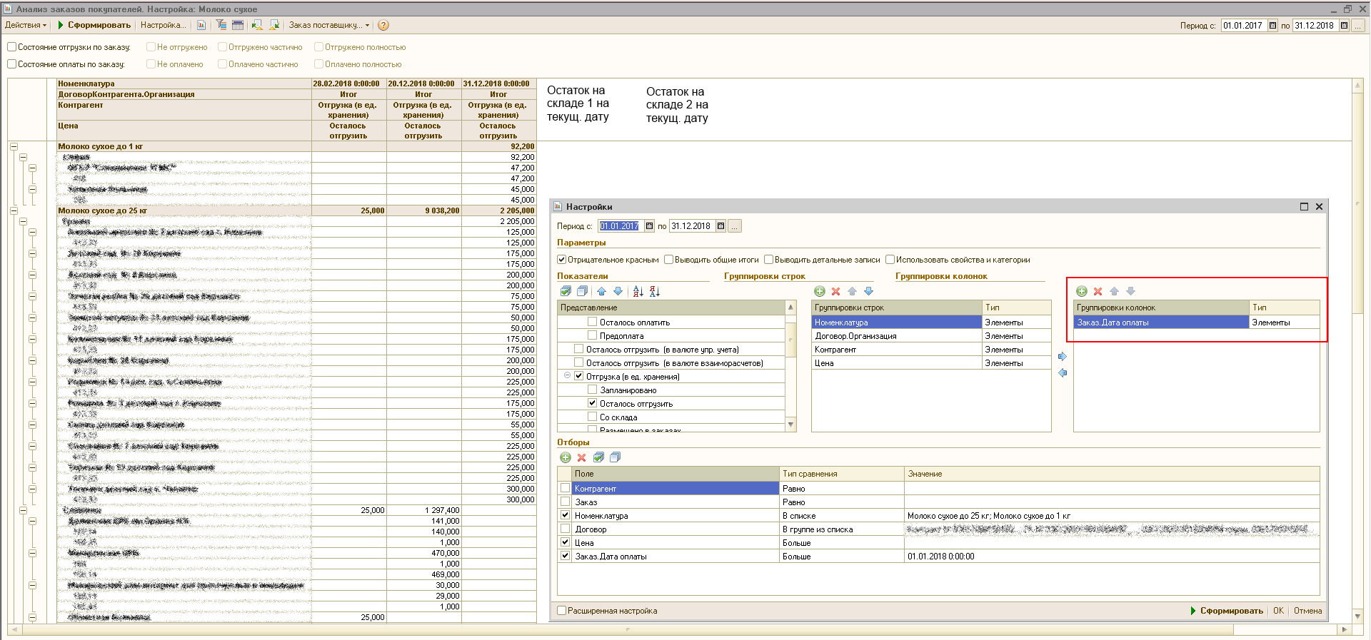 Требуется сделать внешний вариант типового отчета Анализ заказов покупателей из УТ 10.3 с небольшой модификацией - добавить в конце две колонки, в которой будет выводиться остаток номенклатуры на текущую дату по складам (2 склада). При этом колонки должны выводиться только один раз в конце таблицы, при любых настройках группировки колонок.