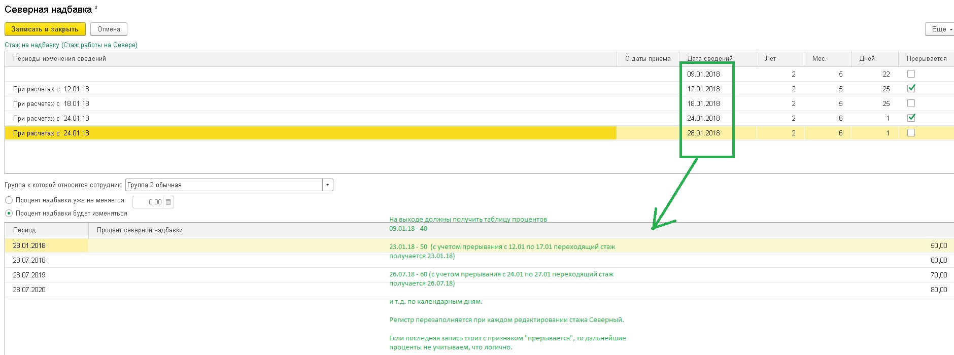 Нужна доработка в ЗУП модуля заполнения регистра сведений "проценты северной надбавки физических лиц" с учетом прерываний северного стажа сотрудника. При многократном использовании прерываний стажа штатный модуль заполнения процентов работает некорректно!