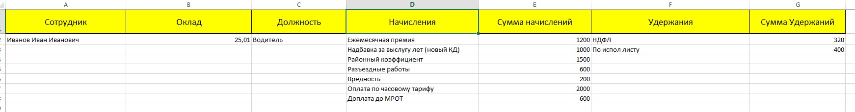Сотрудник , Должность , Оклад , Начисления (нужно вывести все начисления), Удержания (аналогично с удержаниями). Со строкой итога.
