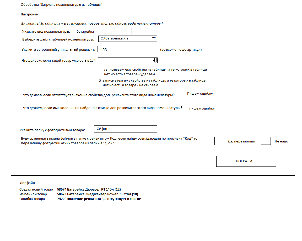 В общем, я думаю, что идея ясна - я время от времени редактирую эту таблицу свойств товаров, добавляя в нее новые колонки и их значения, новые строки товаров, после этого я запускаю обработку и загружаю в 1с по товары каждого вида номенклатуры, предварительно указав что делать с найденными товарами.