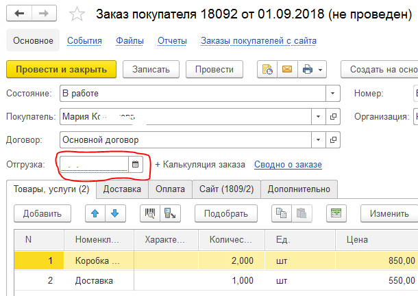 - поле с датой "Отгрузка" должно заполняться