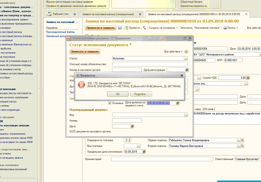 документ Заявка на кассовый расход сокращенная в БГУ, при установке статуса исполнено вылетает ошибка, см скриншот
