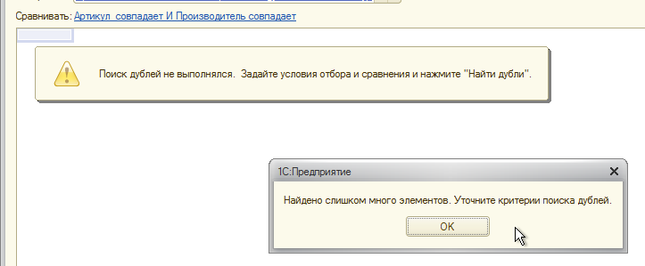 Типовая обработка не справляется с большими объемами данных, и выдает сообщение "Найдено слишком много элементов. Уточните критерии поиска дублей."