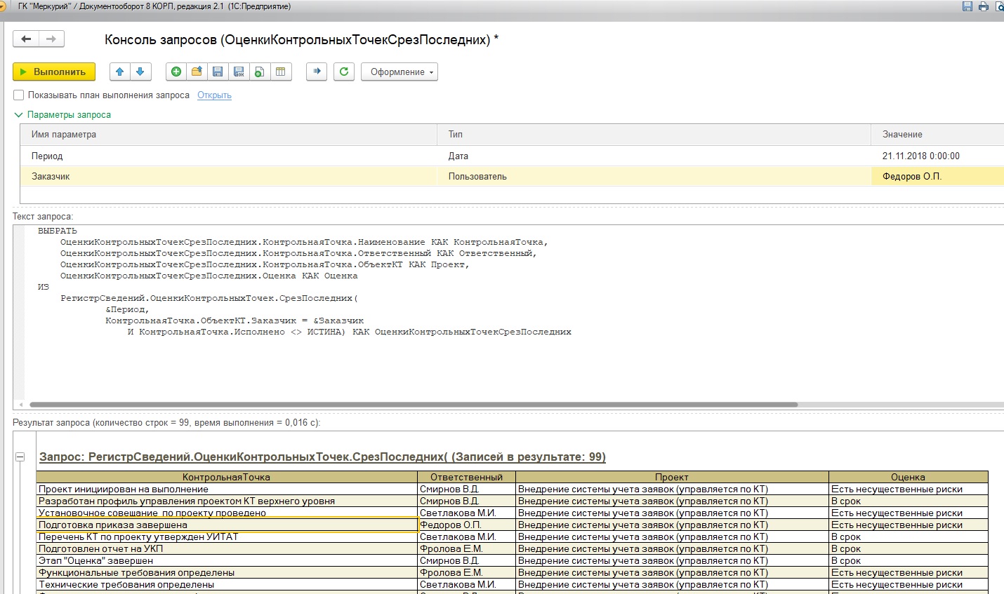 Запрос в Демо базе возвращает правильные данные для текущей даты и Заказчик Федоров.