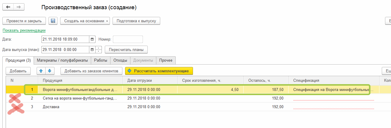 2. Подбор номенклатур в ТЧ: В табличную часть необходимо подбирать только номенклатуры с определенным видом "Продукция производимая". (аналогичная доработка уже есть из заказа клиента)