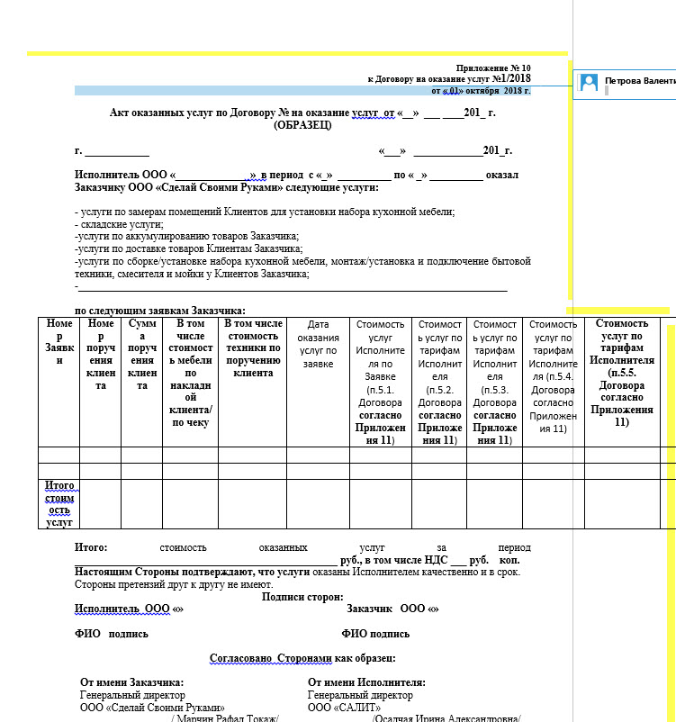 Требуется сделать макет в 1c по Word файлу во вложении ( что-то типа "Акт оказанных услуг") , все должно влезать на страницу , ориентация альбомная или книжная, скорее всего влезет в книжную , для всех полей макета нужно дать имена параметров. На картинке показал как примерно должно выглядеть.