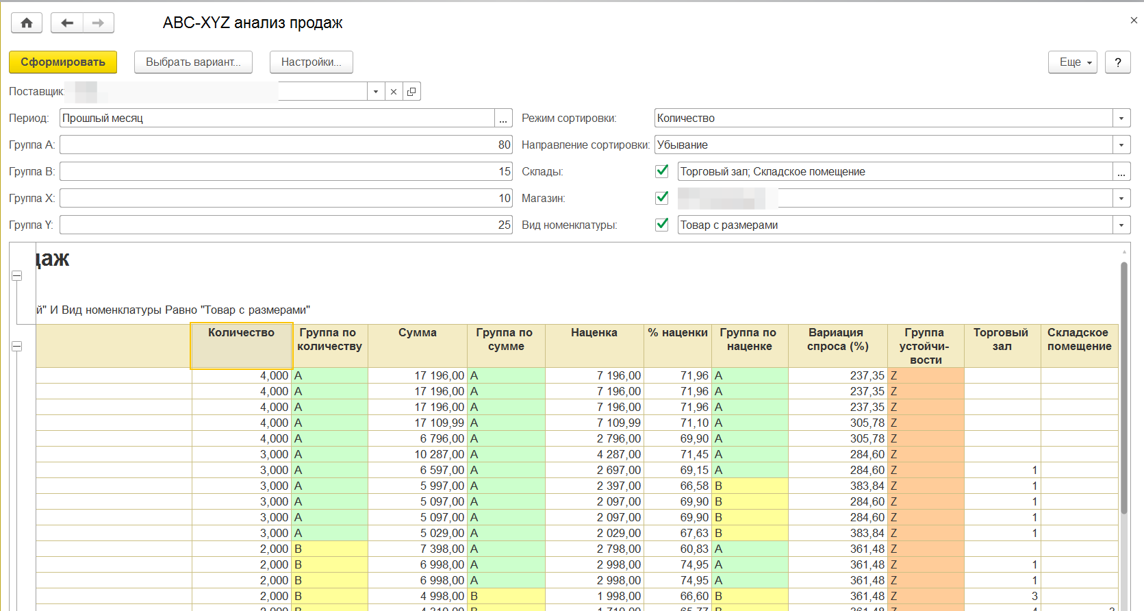 Требуется доработка отчета abc xyz с добавлением колонок текущие остатки: "склад", "магазин".