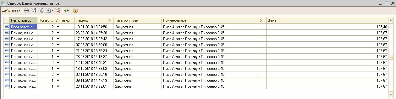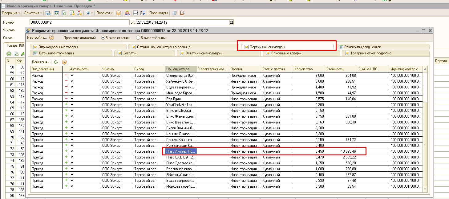 Предварительно проблема вытекает из того, что это только по алкогольной номенклатуре (бутылочное) с единицей измерения л. и соответствующим коэффициентом (например, если пиво 0.5, то коэффициент 0.5), которая была так заведена первоначально. Документы существуют с начала 2018 года. Партионный учет включен, отрицательные остатки запрещены. Также замечено, что "неправильная" цена себестоимости вытекает из подсчета инвентаризации в регистр "Партии номенклатуры" ( хотя Метод расчета цен излишков выставлен как "По закупочным ценам")