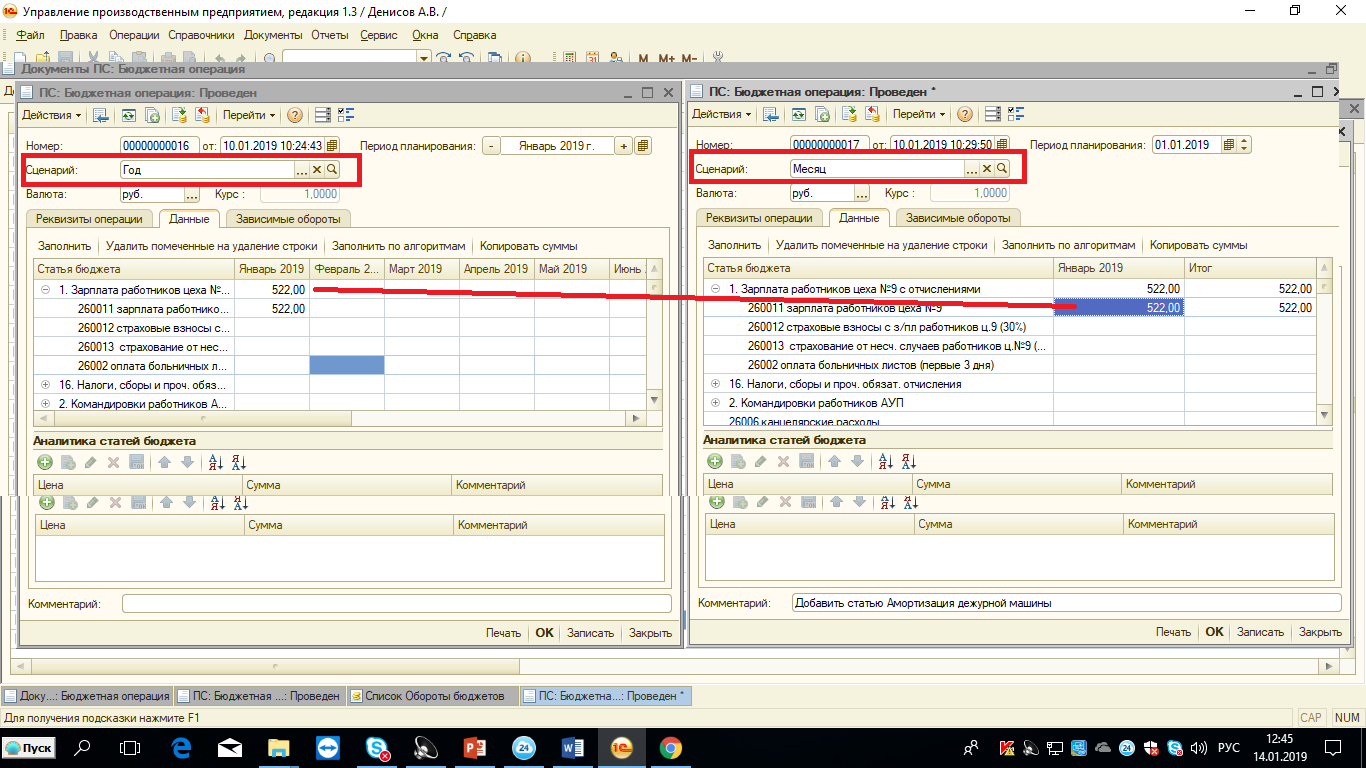 Доработанная конфигурация УПП. Существует документ "ПС_бюджетная операция". Может создаваться со сценарием "ГОД" и со сценарием "Месяц". Если выбран сценарий год, то вид и состав документа меняется и имеет колонки Январь, февраль, и т.д. Если выбран "Месяц", то следовательно только одна колонка. При проведении документ делает движения в оборотный регистр "Обороты по бюджетам".