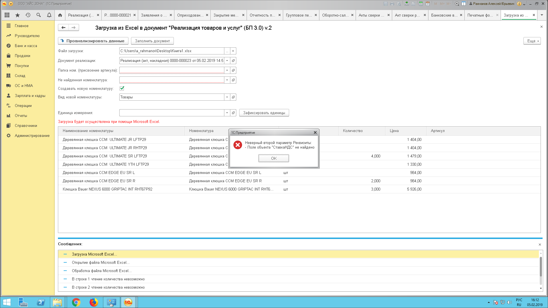 Краткая инфа: загрузка происходит из excel в программу, в раздел документ реализация товаров и услуг и документ поступление товаров и услуг.