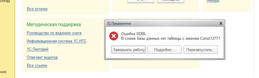 Сегодня утром произошла ошибка с базой, скорее всего из-за некорректного обновления, обновляли из франи приходящий прогер, теперь он трубку не берет. При входе в базу через пару секунд вываливается Ошибка SDBL, отсутствует в схеме таблица. В режиме Конфигуратора выгрузил базу в файл dt. Платформа 8.3.12.1685. Снимок с ошибкой во вложении. За исправление оплата сразу по факту. Бюджет 1500 р. Кто сталкивался и кому удалось исправить пишите сразу в личку я скину dt рабочей базы. Также добавлю в архив tool_1cd.exe по ходу только ей можно исправить.
