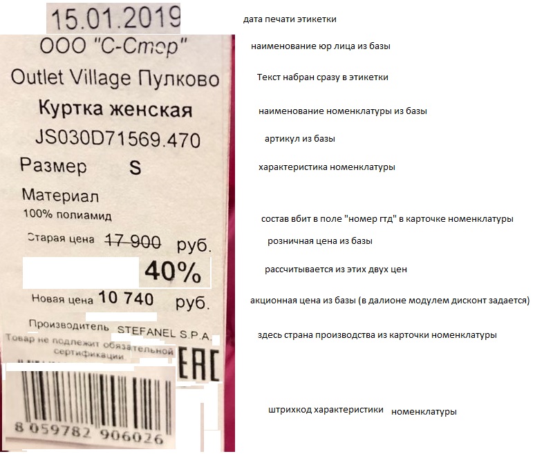 необходимо запрограммировать этикетку размером 70*49,5 мм (размеры бумаги во вложении). образец этикетки с описанием во вложении. также во вложении xml файл старой этикетки, которая использовалась в далионе лайт до подключения модуля Дисконт
