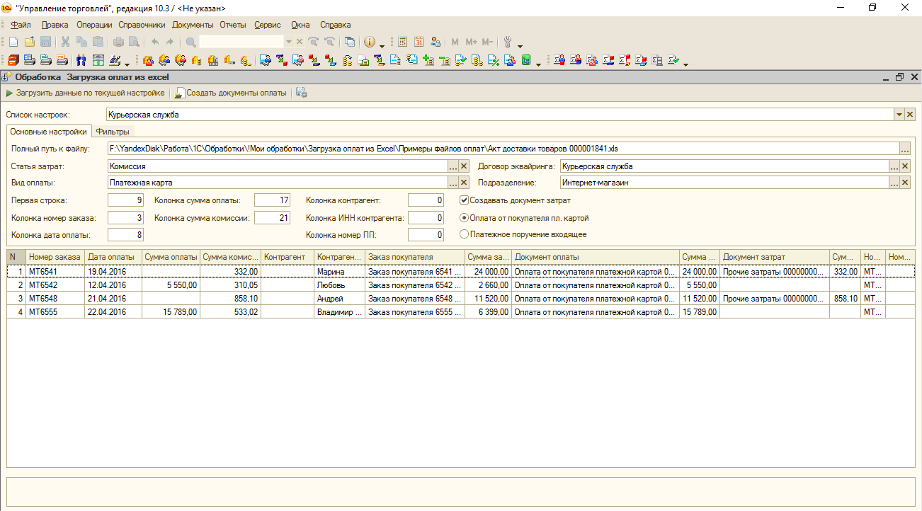 Есть готовая рабочая обработка загрузки платежей из табличных документов (Excel, csv) для УТ 10.3. Обработка универсальная, загружает все типы оплат: безналичная, наличные и эквайринг. При загрузке распознает заказы клиентов, к которым привязаны оплаты и заполняет соответствующие поля в документах оплаты.