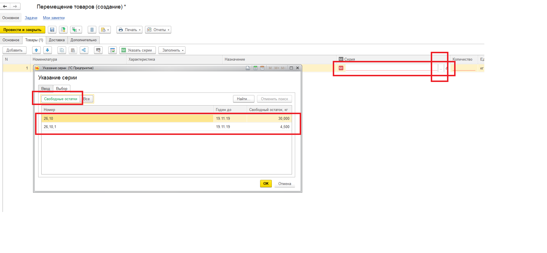 Документ Перемещение товаров, выбираем склад-отправитель, выбираем помещение, в товаров кнопка добавить выбираем товаро, переходим в колонку Серии (на ... точки) должно появиться Закладки Ввод и Выбор. во второй закладка Свободные остатки, должны отображать отставки только этого выбранного помещения в документе