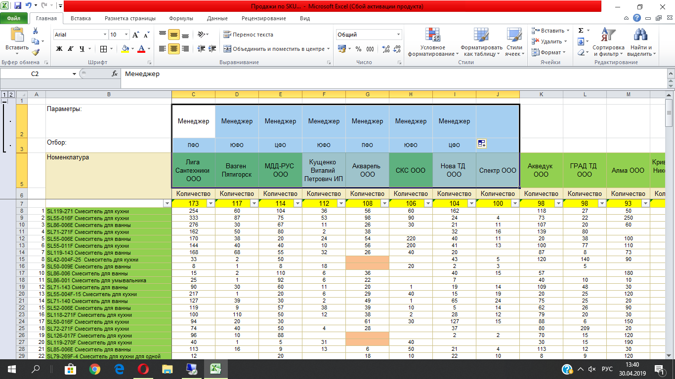 разработка отчета по номенклатуре, менеджерам, ABC, SKU ут10 по скрину.