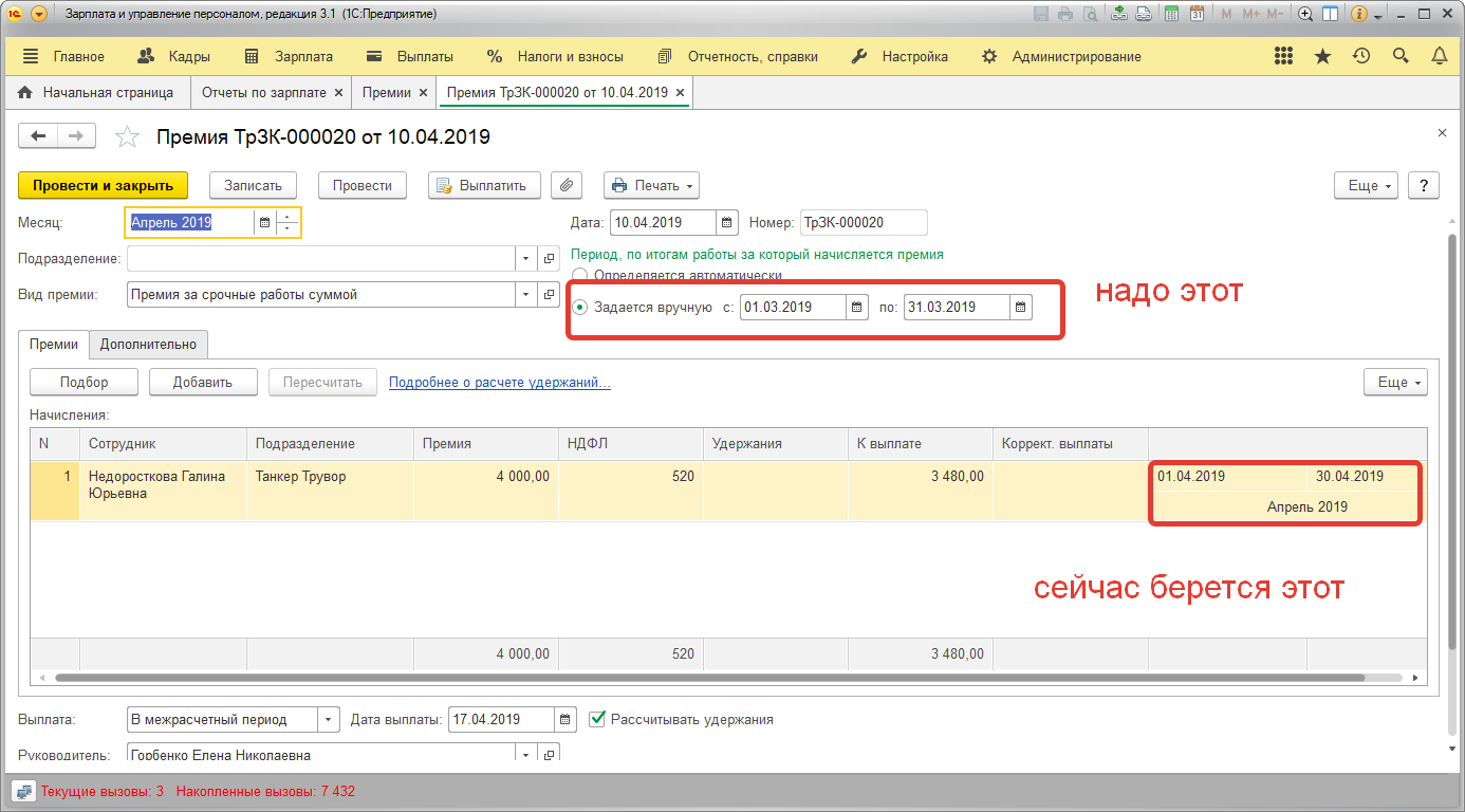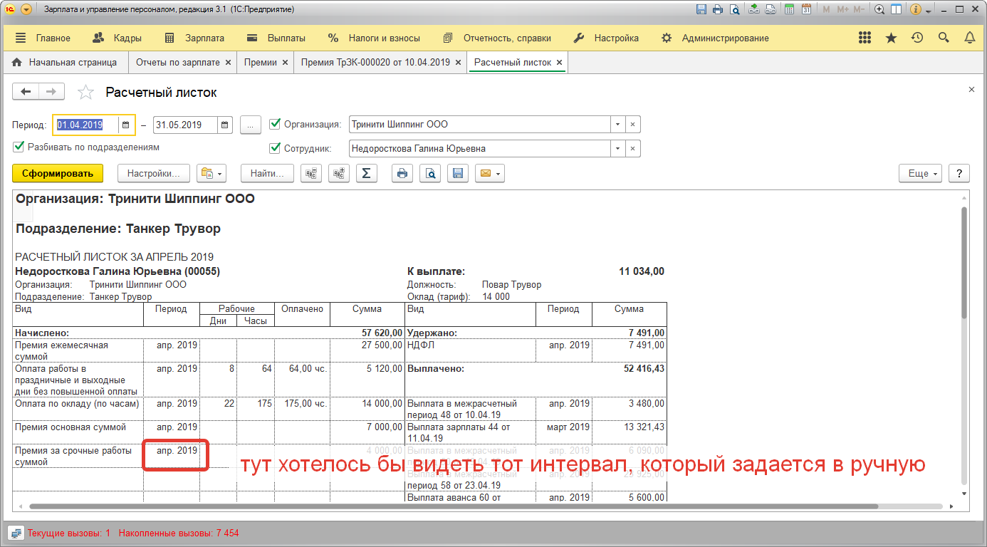 Требуется переделать вывод данных в расчетном листке. Подробнее: чтобы для вида начисления премия, период по итогам работы за, брался не из табличной части документа, а из значений заданных в ручную.