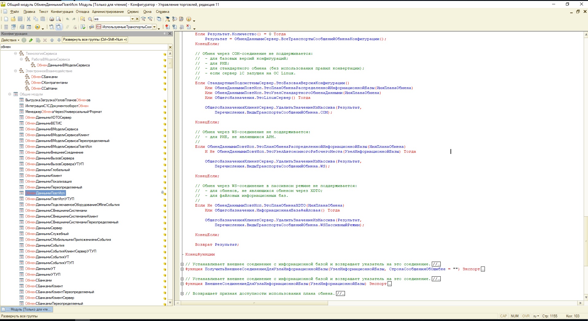 До новых версий УТ11 мы использовали в качестве транспорта РИБ web-сервер. Было очень удобно. Закоментировали небольшой кусочек кода (см. скрин old) в результате в настройках транспорта обмена появлялась вкладка "интернет" и всё работало отлично. Теперь этот модуль немного переработали (см. скрин new), и обмен через WS парестал работать. Точнее работает до открытия кассовой смены, потом перестаёт.