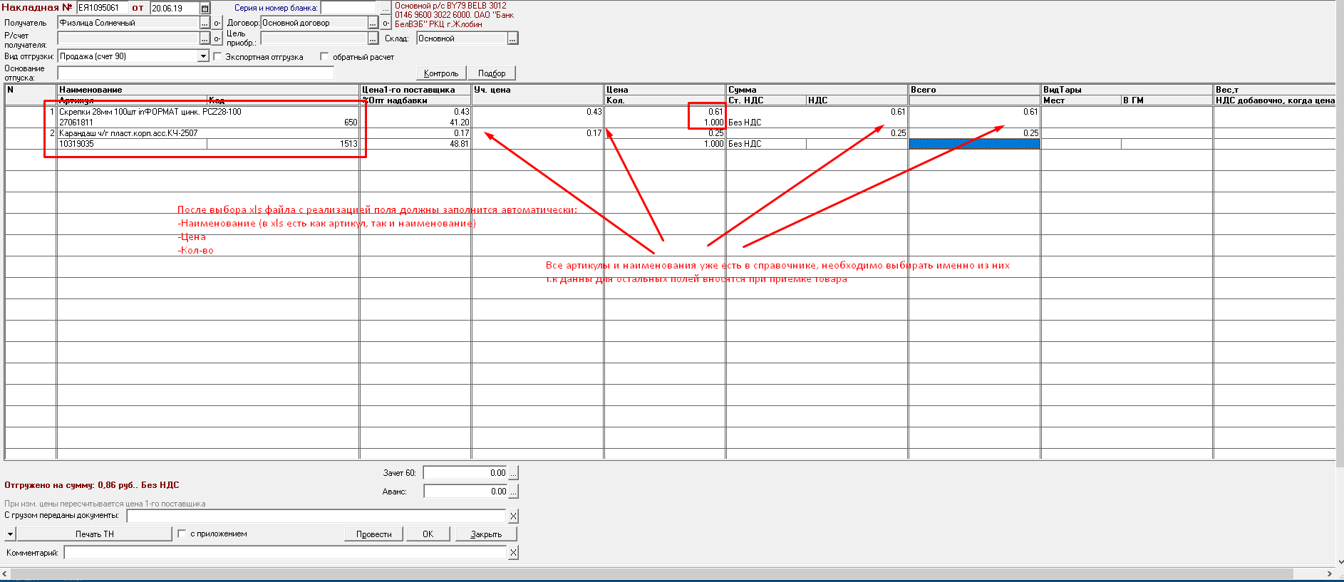 -Необходимо, чтобы данные из реализации загружалась в накладную , после указания xls файла.