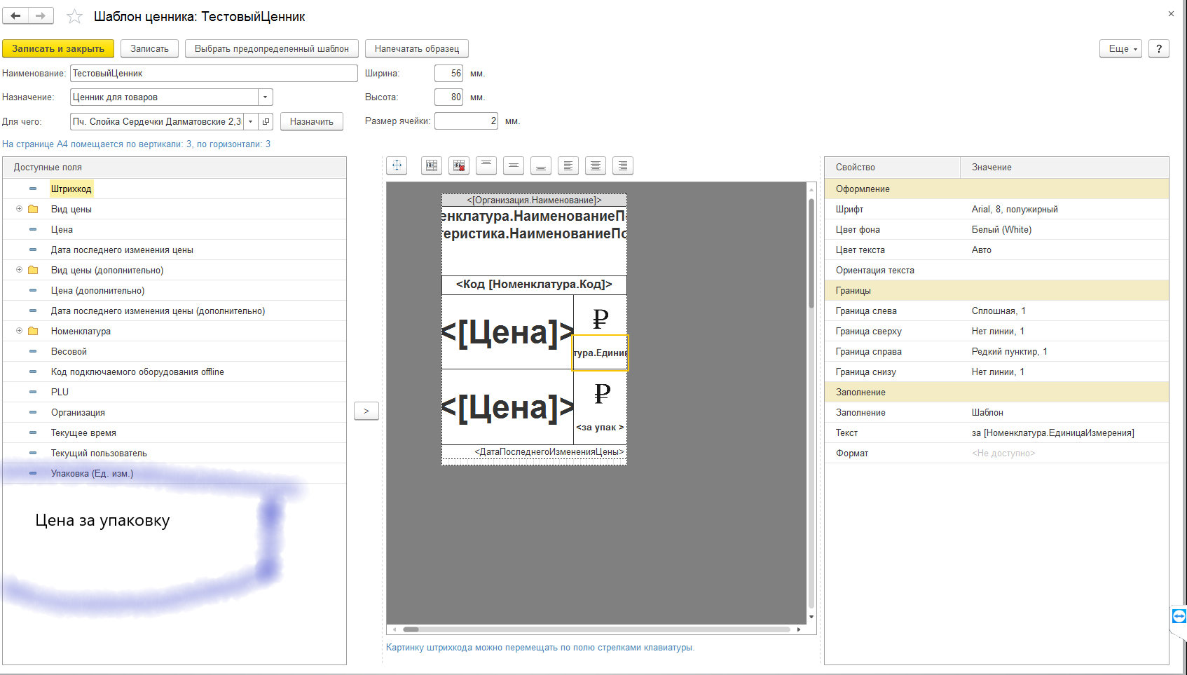 Требуется доработка доступных полей ценника. Имеется номенклатура с базовой ед.измерения и ед.измерения упаковка. Необходимо на ценнике вывести две цены. 1 в базовой ед.изм (за кг), 2 цена за упаковку (за коробку). В стандартном функционале можно вывести только одну цену за выбранную ед.изм. Нужно добавить в доступные поля, поле в котором заложена формула цена за кг * на коэффициент упаковки.