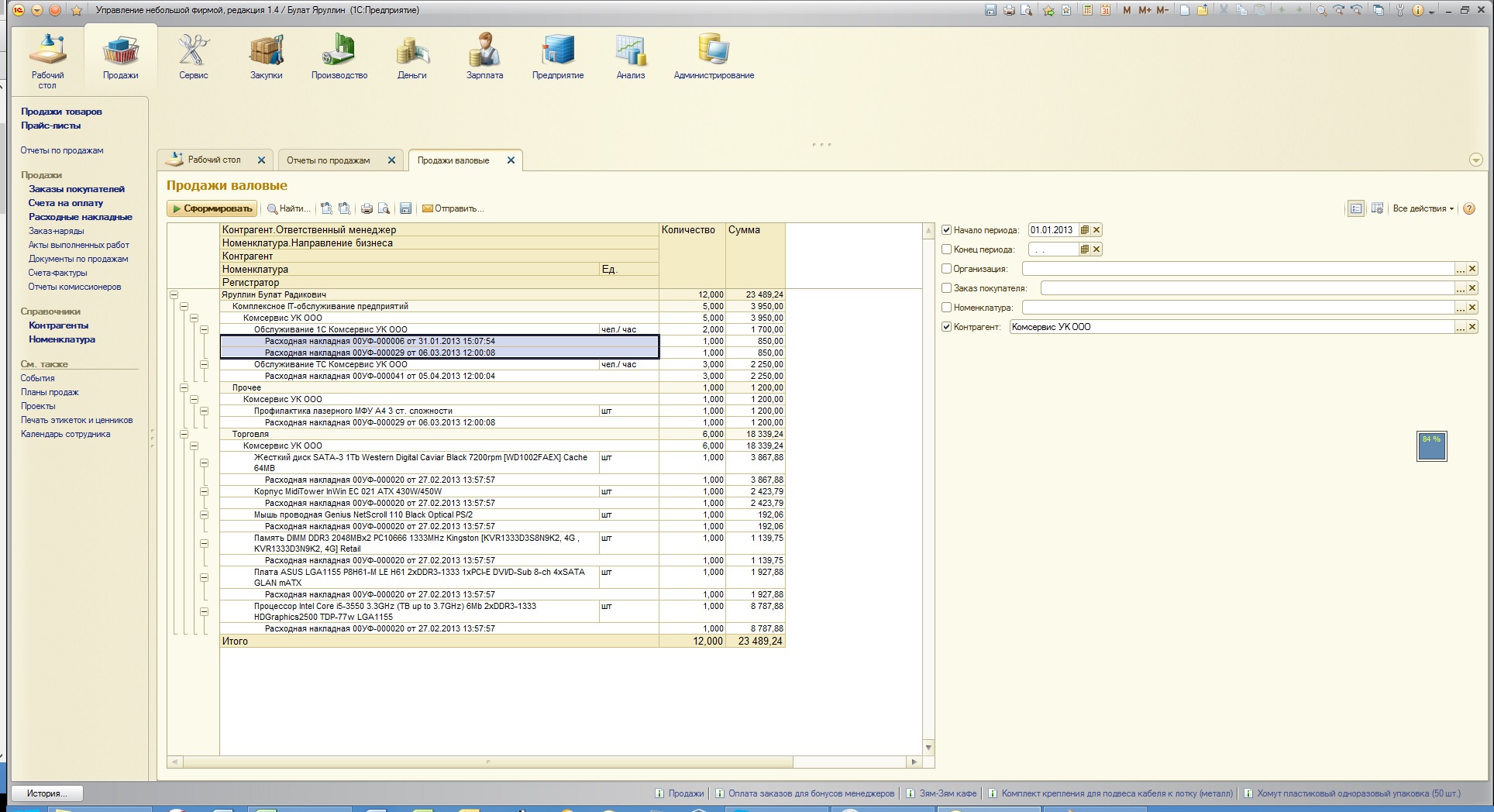 Дано: немного донастроенный стандартный отчет в УНФ "Продажи". Что сделано: добавлена пара группировок. Было: Контрагент -> Номенклатура, Ед. изм. -> Регистратор. Стало: Контрагент.Ответственный менеджер -> Номенклатура.Направление бизнеса -> Контрагент -> Номенклатура, Ед. -> Регистратор.
