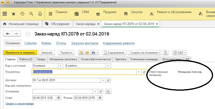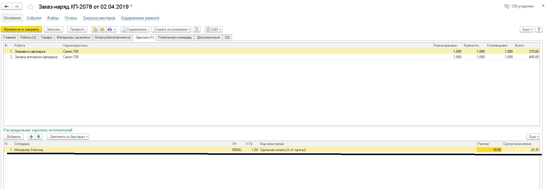 В Управление сервисным центром 1.6.16.176 сделать автоматическую подстановку зарплаты в заказ наряде по ответсвенному