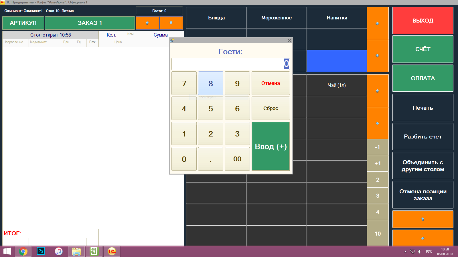 Доработать обработку 1CWinDosPrinter_v2, а именно добавить в чек дополнительную строку "Услуга", которая получала данные о количестве гостей (количество гостей вводится перед заказом), и умножала на n число (саму цену услуги). Эти цифры должны быть только на самом бумажном чеке. Конфигурация Палтусов: Ресторан 2.2.3.162.