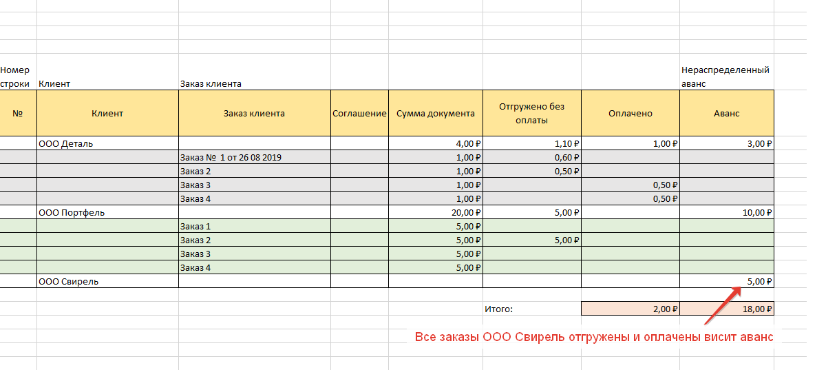 Отчет по заказам клиентов. По отгруженным без оплаты и не распределенным авансам. Важно. Полностью оплаченные и отгруженные заказы клиентов (закрытые) не должны попадать в отчет. Но если все заказы закрыты, но висит аванс пользователь должен увидеть Выполнить на СКД. Должны быть доступны отборы: сегменты контрагентов, соглашения. Необходимо учесть что в конфигурации включен контроль на уровне записи с ограничением по контрагентам. Колонки и данные указаны в скрине.