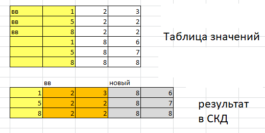Есть таблица значений. Из неё нужно сформировать отчет СКД, чтобы два набора данных были расположены рядом,