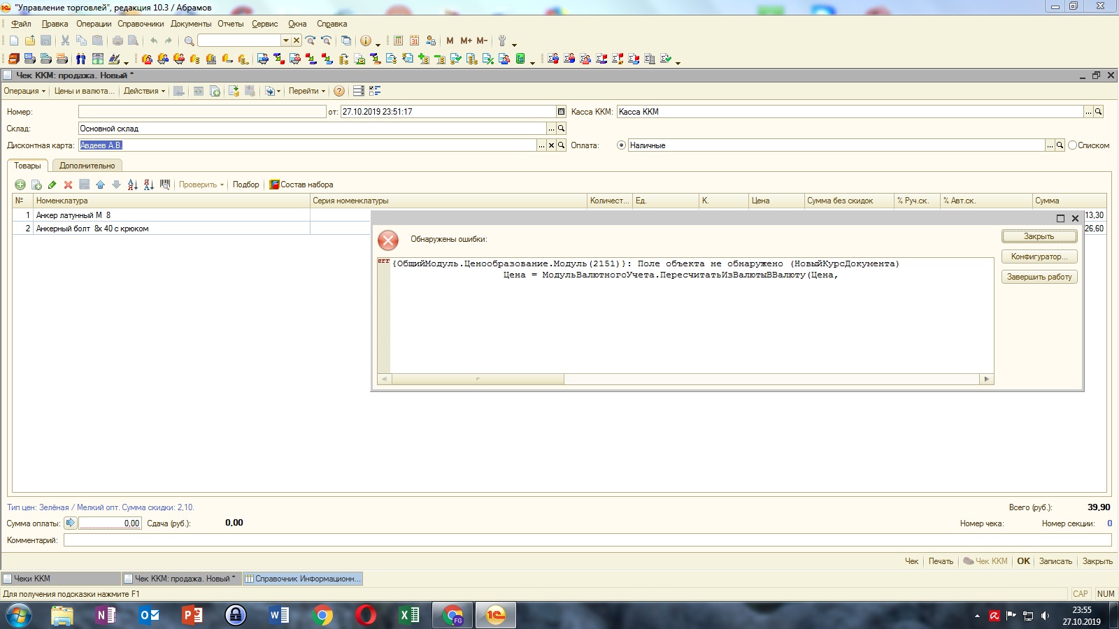 Исправить ошибку пр выборе дисконтной карты УТ10,3