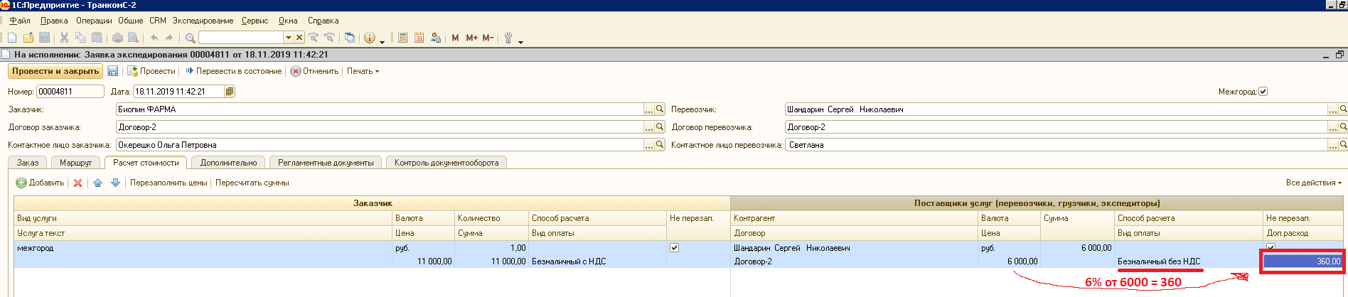 2) В документе заявка экспедирование есть поле Доп.расход. Он считается по формуле: сумма перевозчику * 6%.