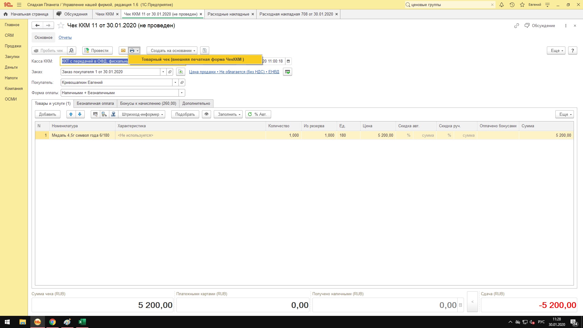 Товарный чек в ЧЕКах ККМ, с указанием цены за 1 шт (1С УНФ)