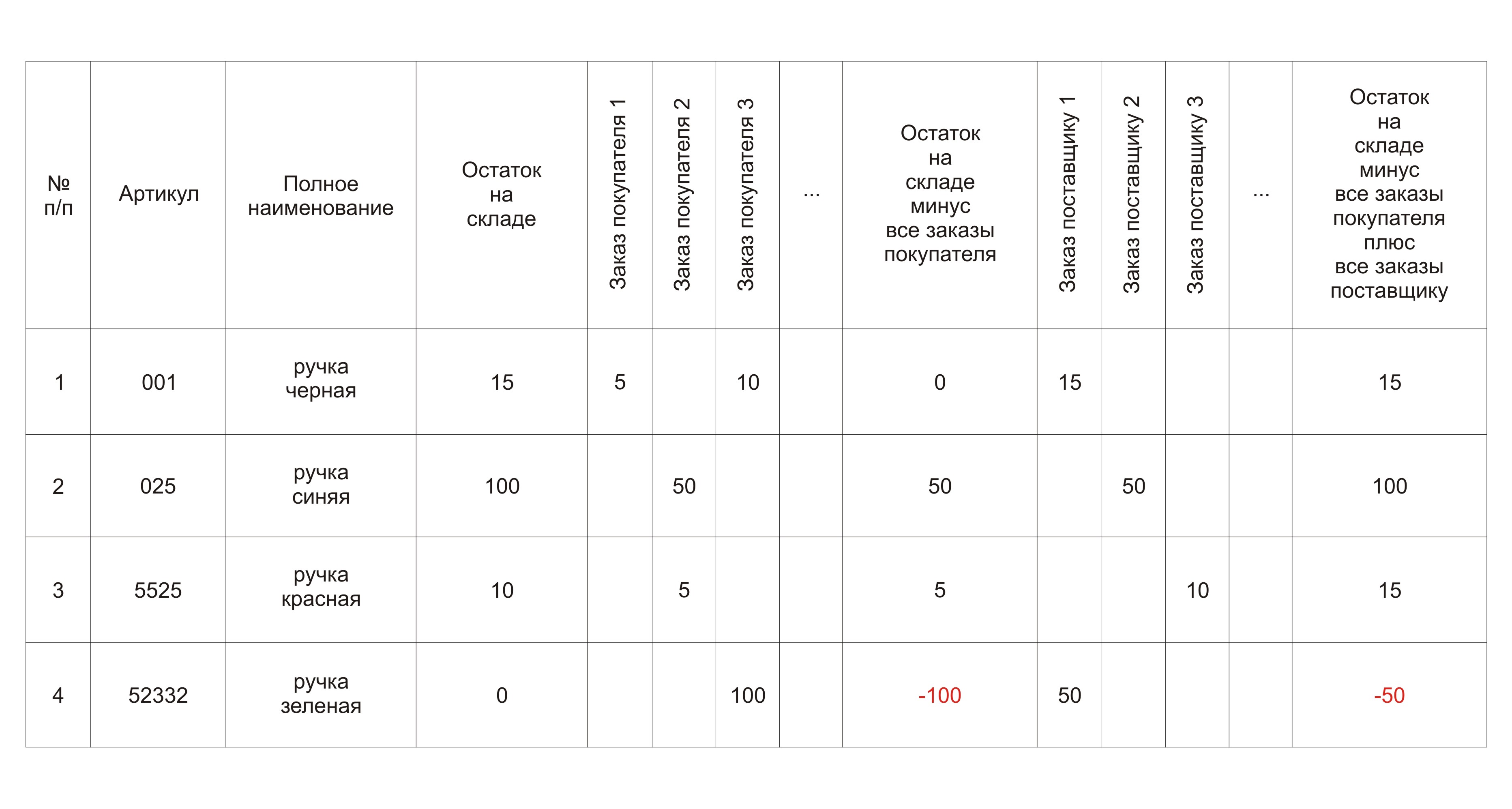 |№|Артикул|Полное наименование|Текущий остаток на складе|Заказы покупателей 1, 2, ...|Остаток на складе - Заказы покупателей|Заказы поставщику 1, 2 ...|