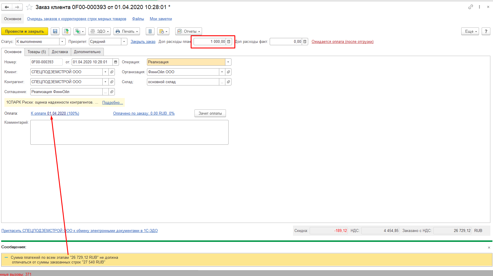 отличаться от суммы заказанных строк "27 540 RUB"" - т.е. изначально была сумма по заказу 26 540, добавили в поле ДопРасходыПлан 1000, ТЧ Товары пересчиталась, однако записать не дает. Необходимо, чтобы "Сумма платежей по всем этапам" ""заполнялась"" адекватно.