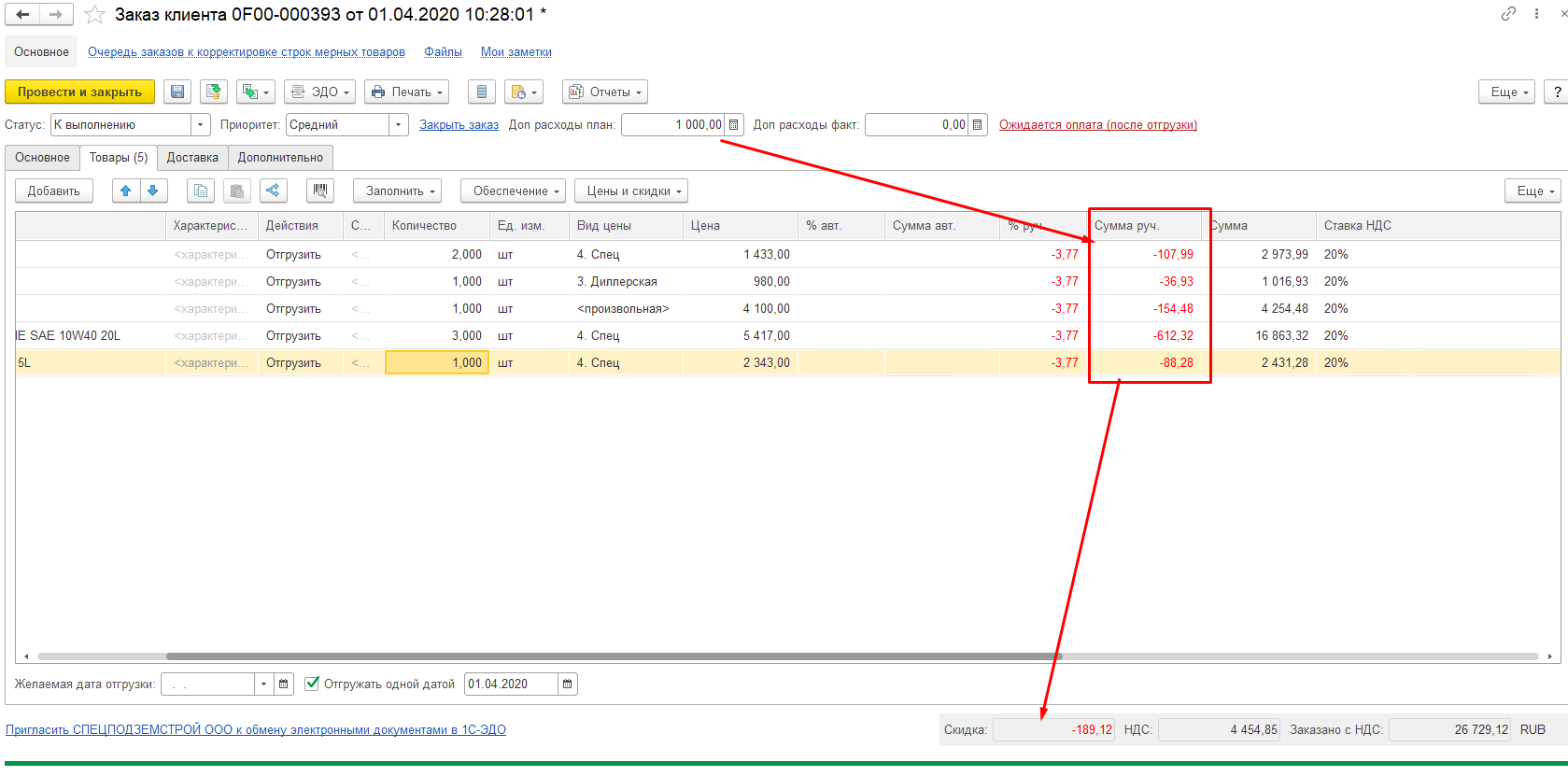 2) проблема при записи заказа, после изменения поля ДопРасходыПлан - выдает ошибку (например):