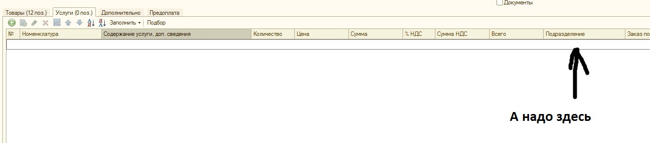 1. В задаче №1 нужно сделать так, чтобы была возможность пакетно менять подразделение во вкладке "Услуги" в документах "Поступление товаров и услуг"