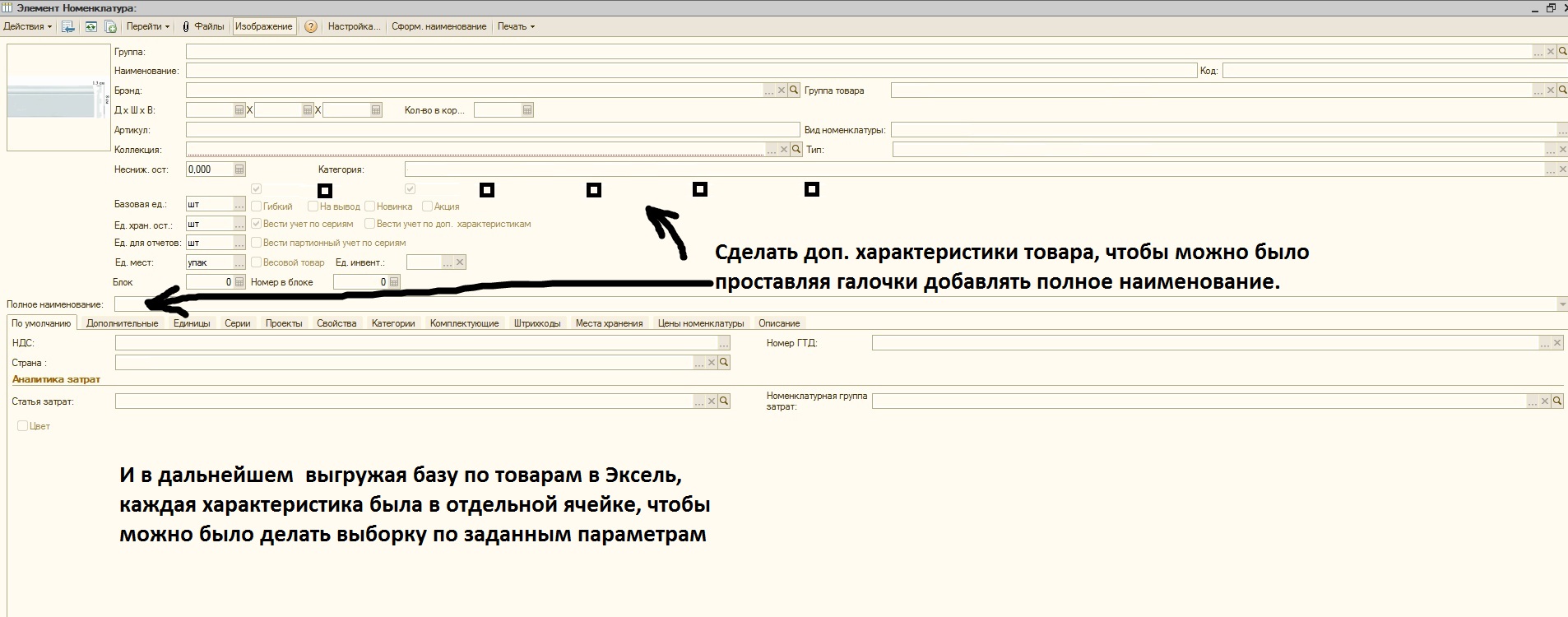 2. Изменить карточку товара (добавить галочки), чтобы выбирая ту или иную характеристику , это прописывалось в полное наименование. И в дальнейшем, выгружая базу в эксель, все характеристики были прописаны в отдельных ячейках, для возможности работы с этими данными и выгрузки их на сайт.