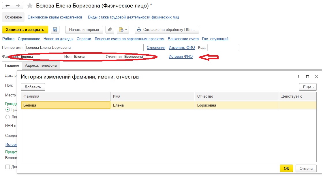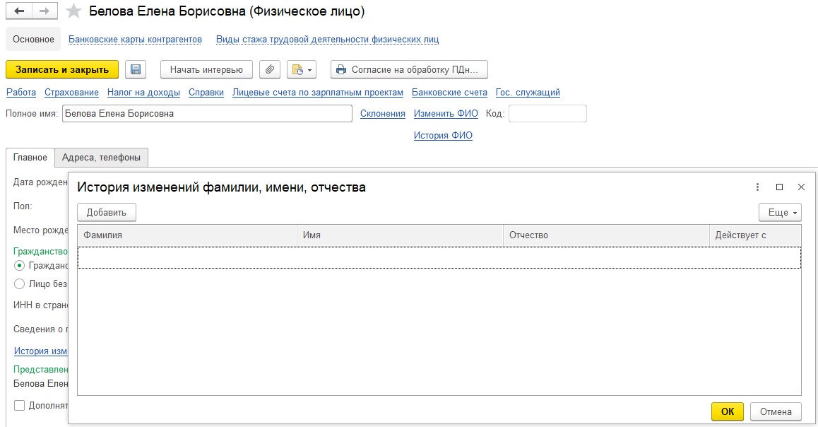 Требуется обработка для ЗКГУ. Необходимо заполнить регистр сведений "История ФИО" в справочнике Физические лица на основании Полного имени. Из-за отсутствия регистра не корректно создаются сотрудники.