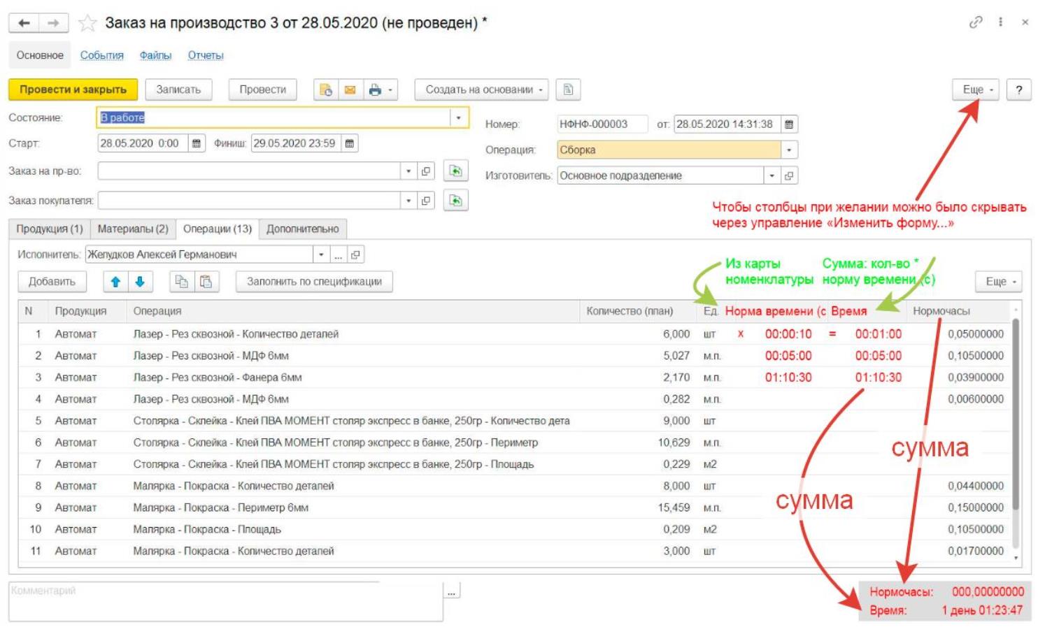 1. В карте номенклатуры для типа данных "операция" добавить новый реквизит: норма времени (с) - это целое число, для хранения целого количества секунд. Секунды удобно складывать между собой и умножать на Количество и опять складывать для получения Общего Времени, в секундах, но выводить в формате Дата/Время - например: 1 день 00:05:32